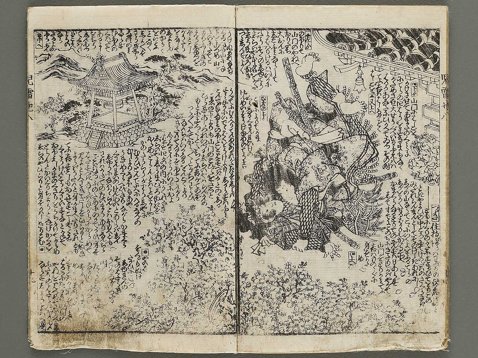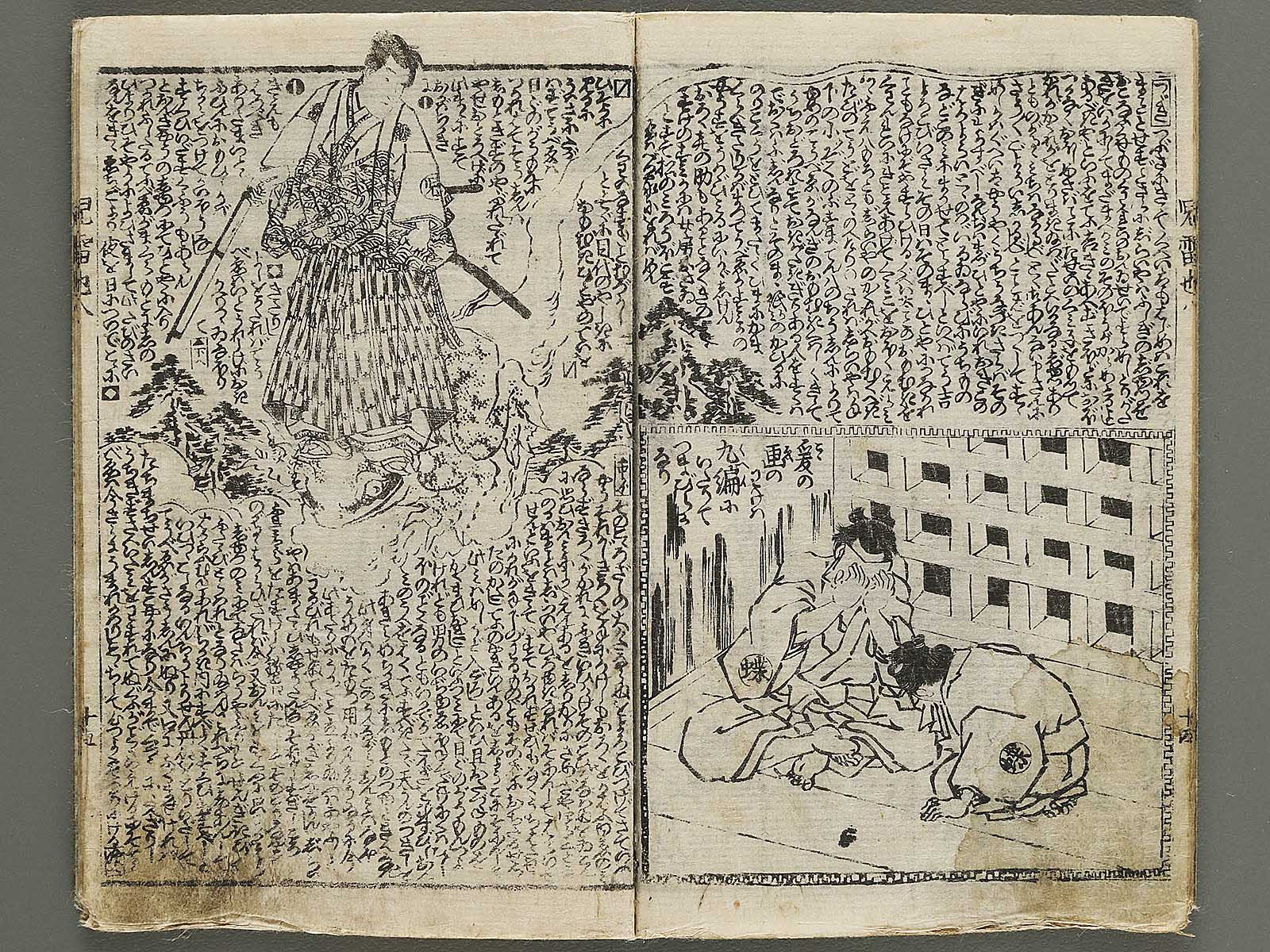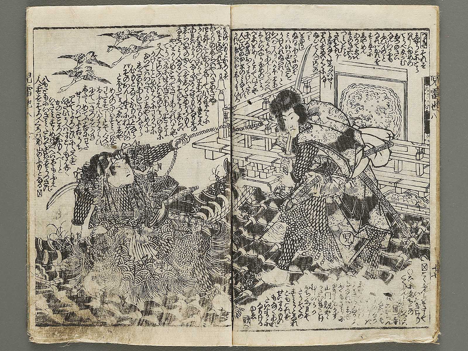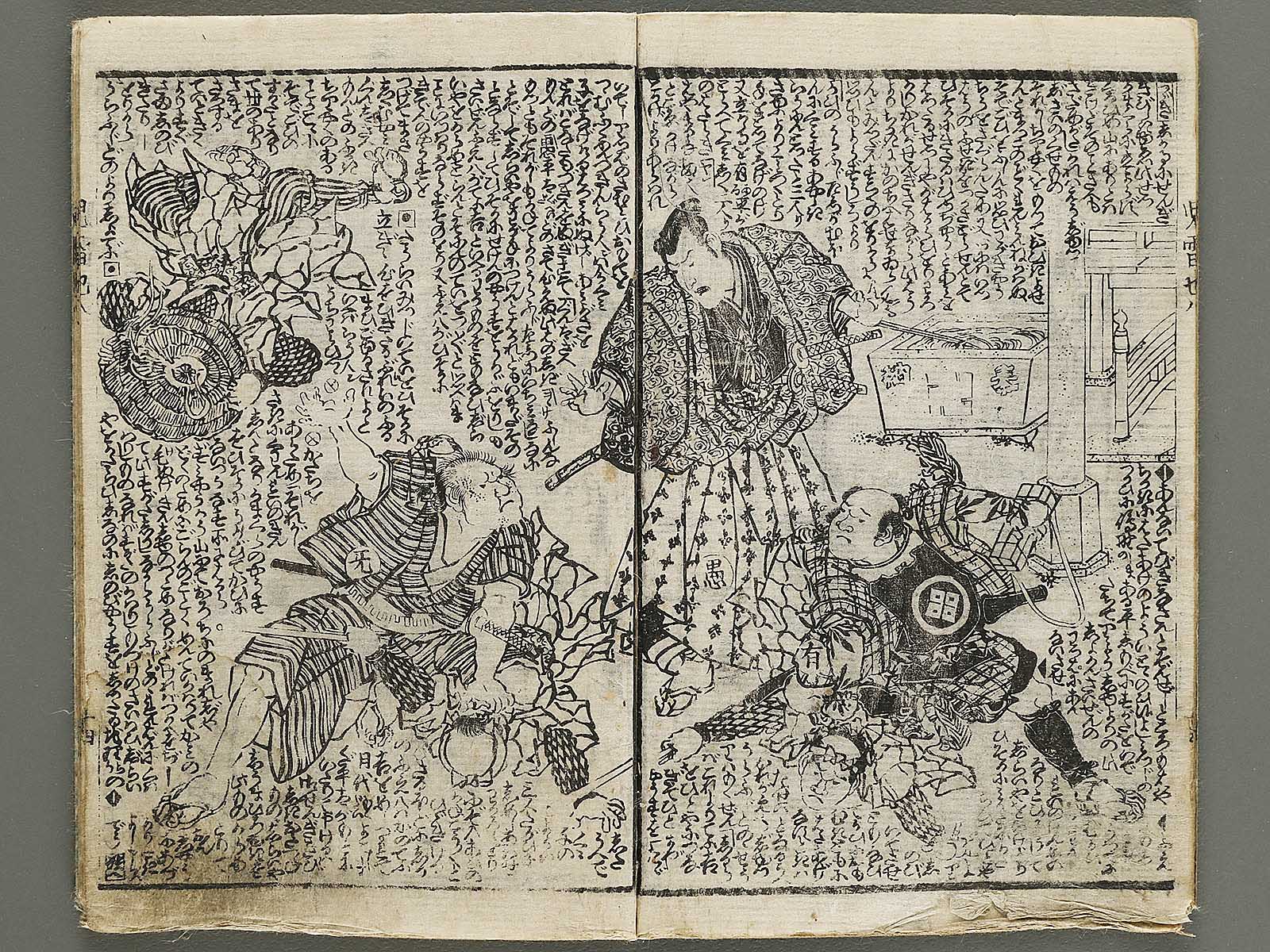 Topic : Novelists including Egao Mizugaki/Ryukatei Tanekazu wrote this book from 1839 to 1868. It is a full-length work consisting with 43 volumes of 172 books, not to be completed yet. The main character, Jiraiya(Jiraiya is a ninja), acquires the special power and fights battles against villains and nemeses. This book had been a subject matter of Kabuki(Japanese classical drama) in the Edo period and today the one for movies and so on.