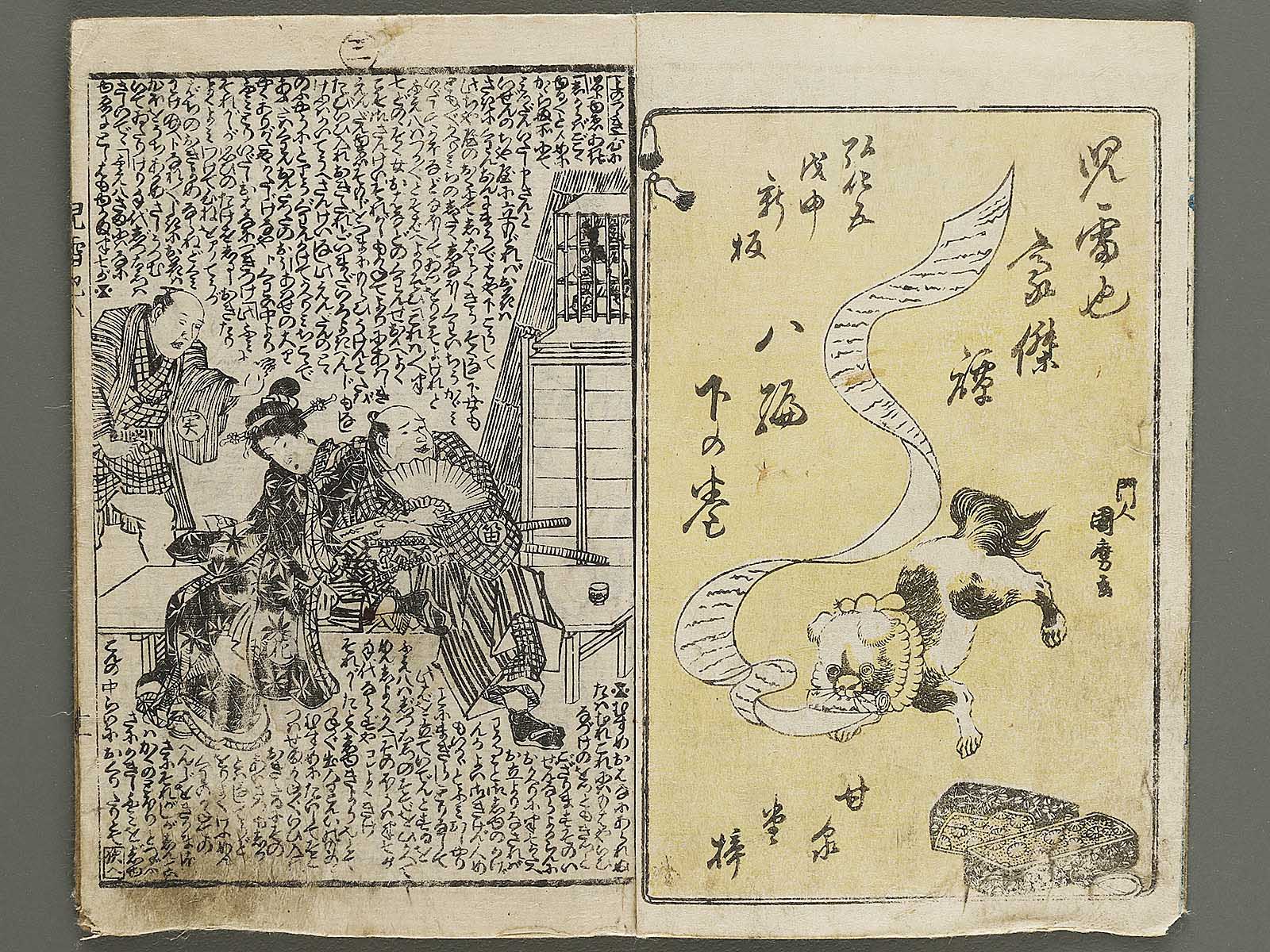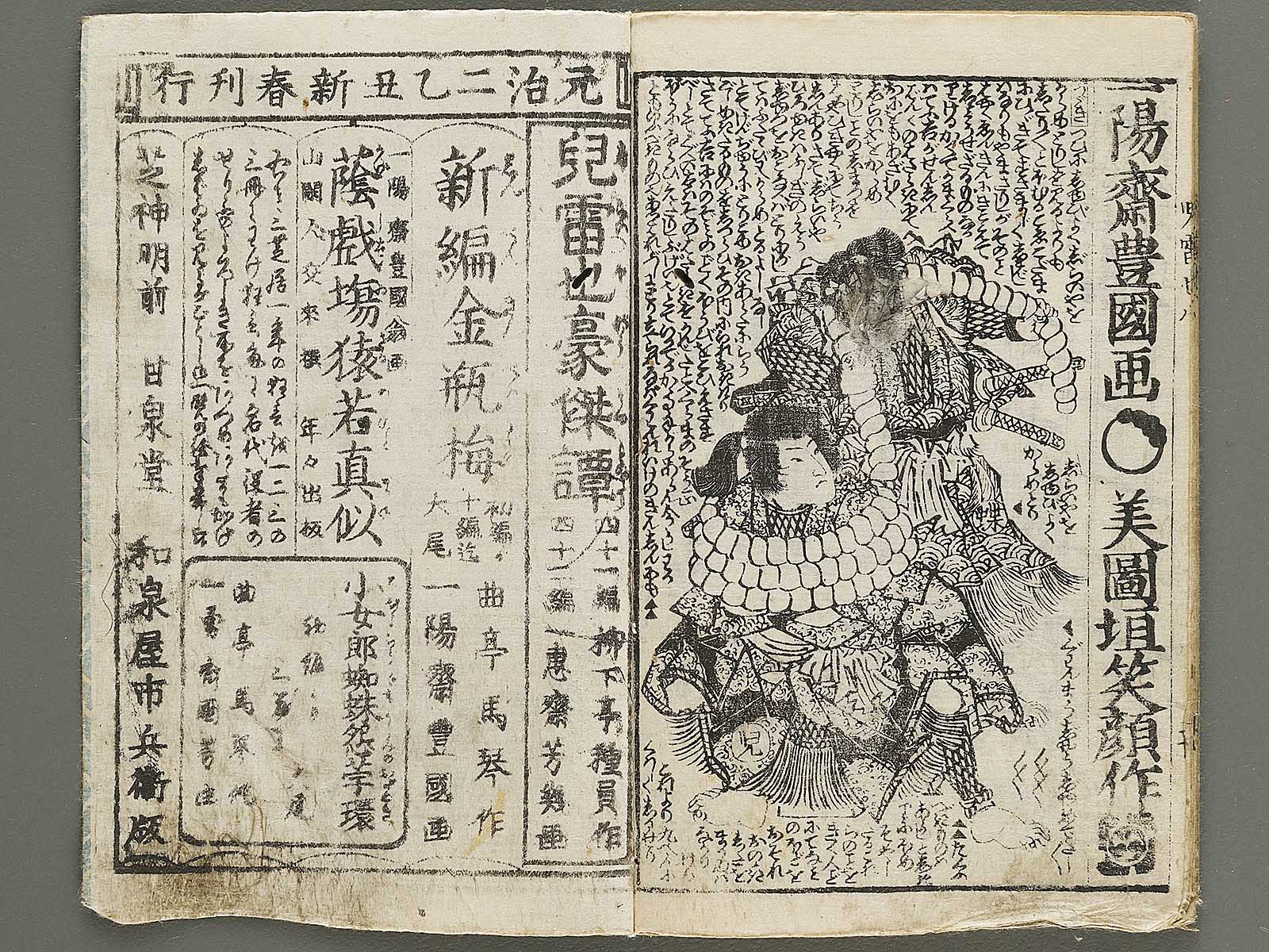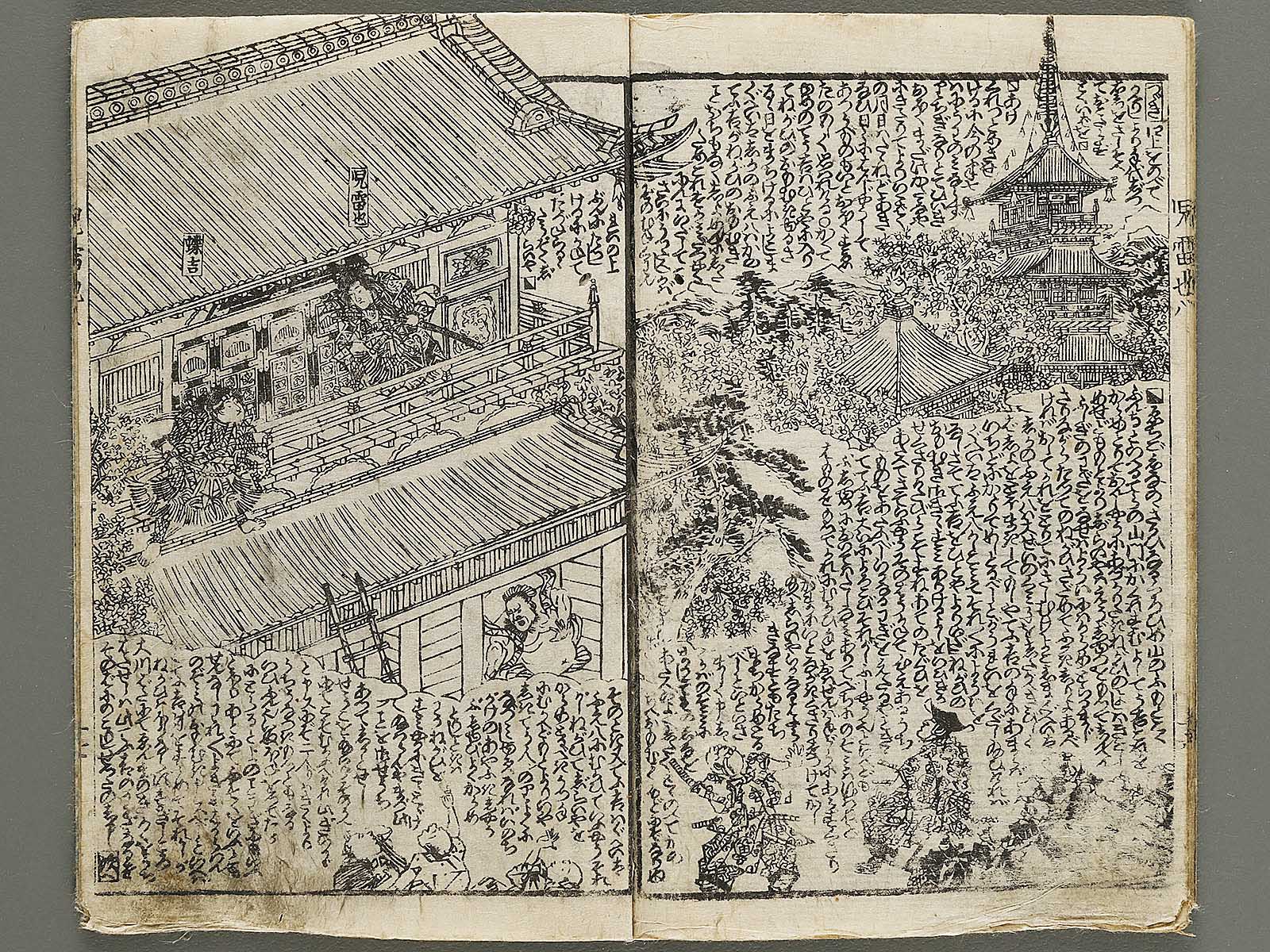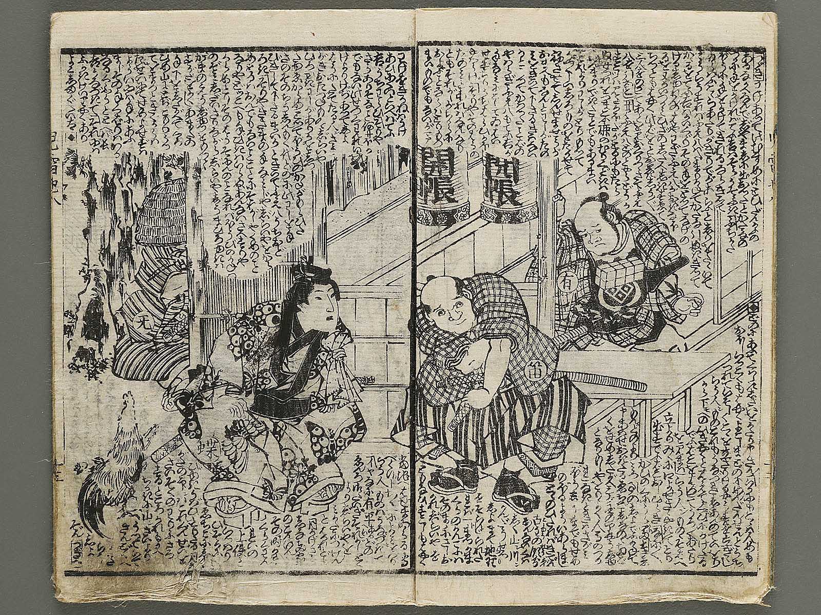 Topic : Novelists including Egao Mizugaki/Ryukatei Tanekazu wrote this book from 1839 to 1868. It is a full-length work consisting with 43 volumes of 172 books, not to be completed yet. The main character, Jiraiya(Jiraiya is a ninja), acquires the special power and fights battles against villains and nemeses. This book had been a subject matter of Kabuki(Japanese classical drama) in the Edo period and today the one for movies and so on.