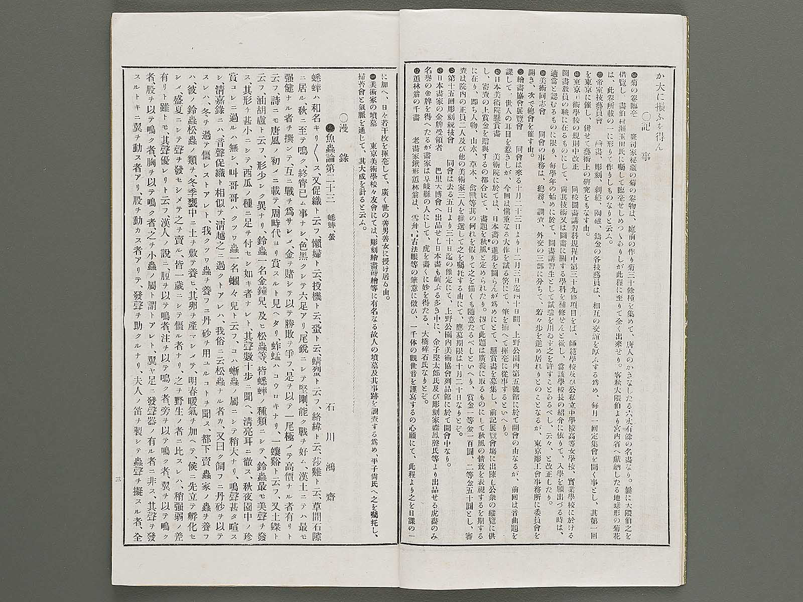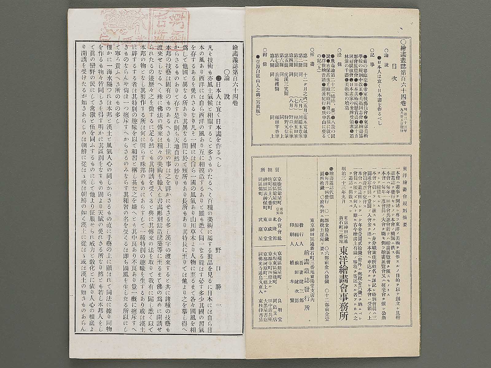Topic : The official newspaper of Toyo kaiga kai. It contains illustrations by famous painters and articles about exhibitions and Western painting.