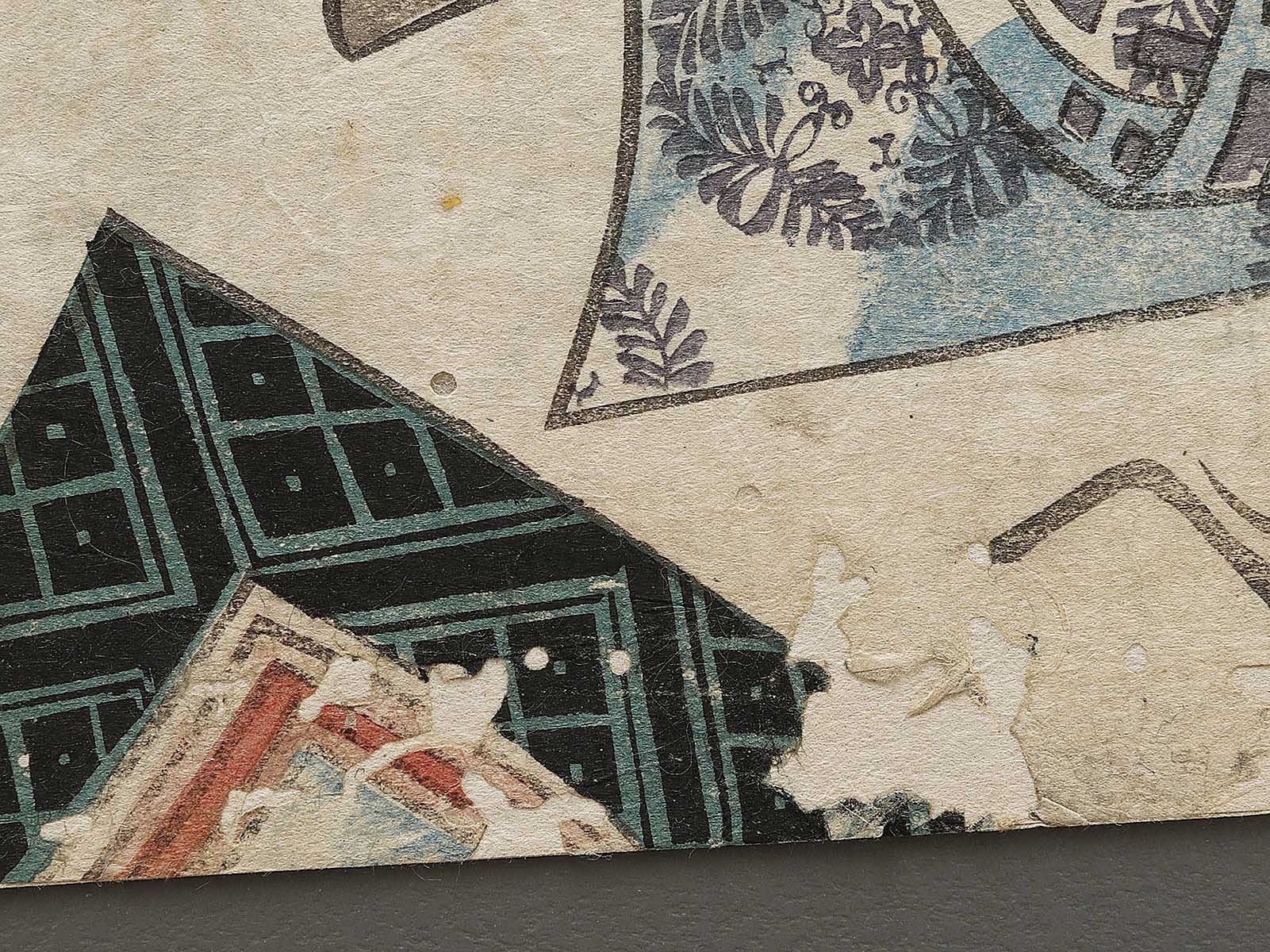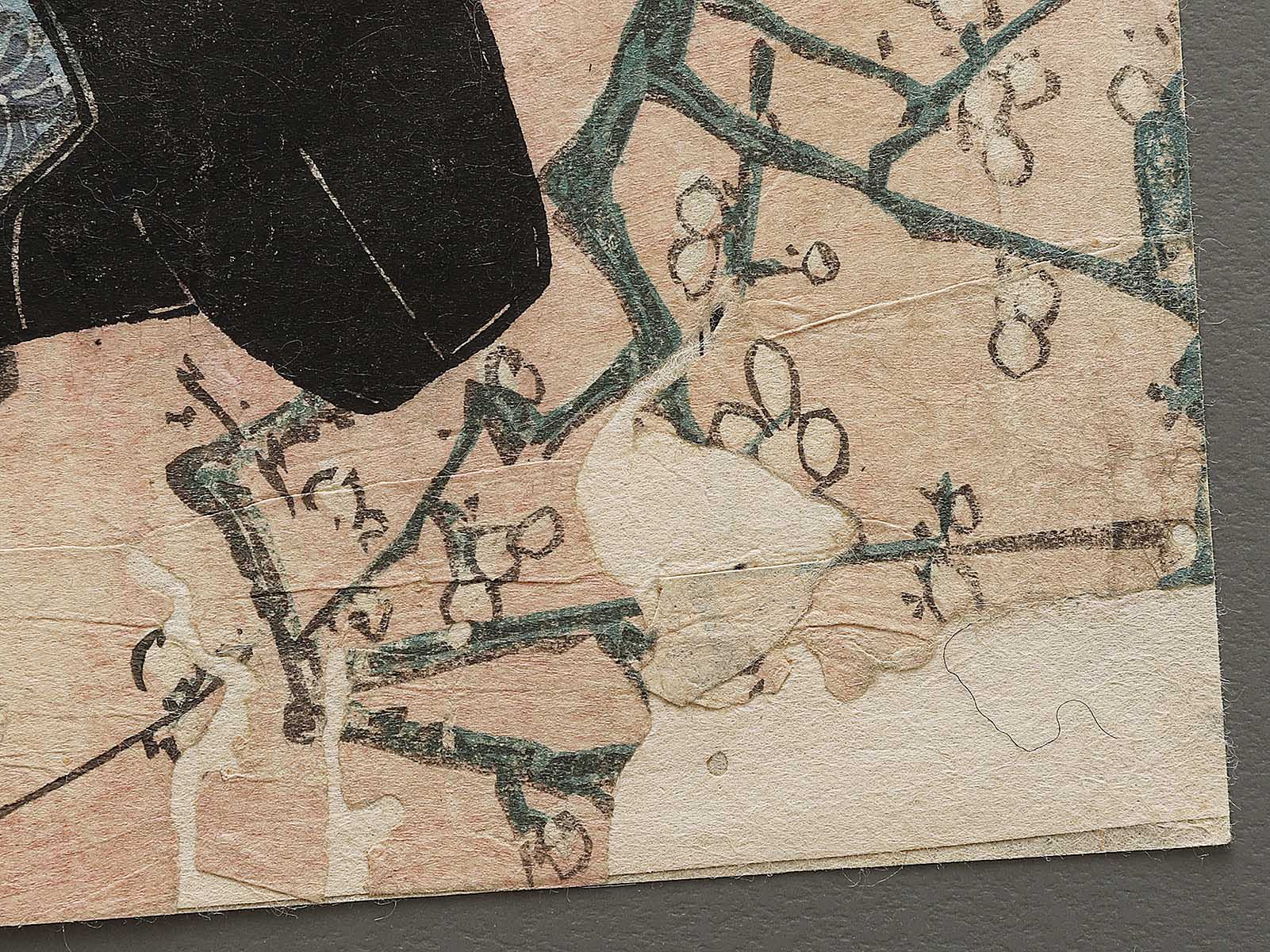Condition : Antique item; (damaged by tear, spot, dirt, scribbles, worm-eaten holes, etc...) Please view pictures as they are a part of the description. Originally, it is a woodblock print consisting of three pieces, but since two piece is missing, there is only one piece in total. There is reinforce with backing.(urauchi)