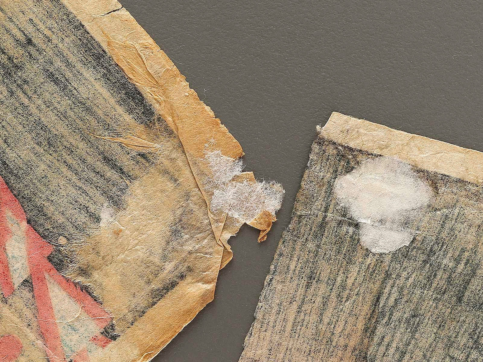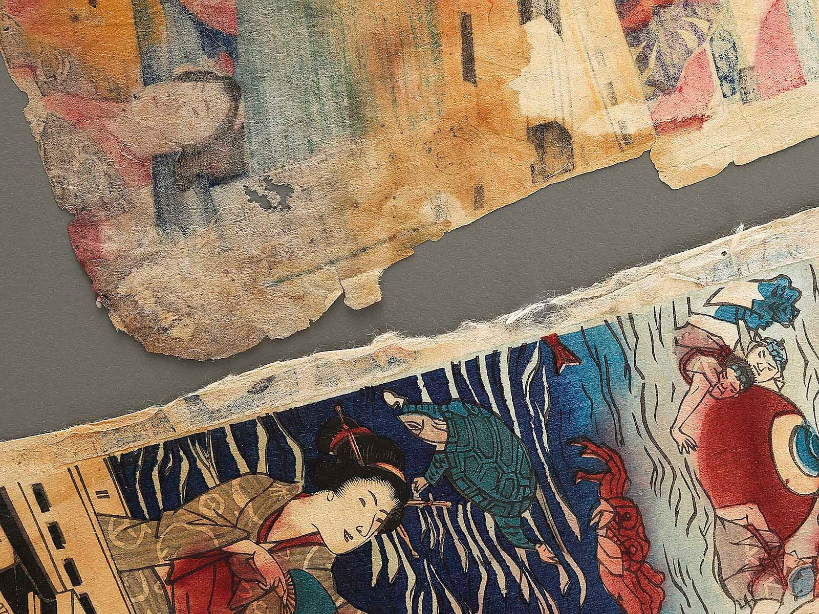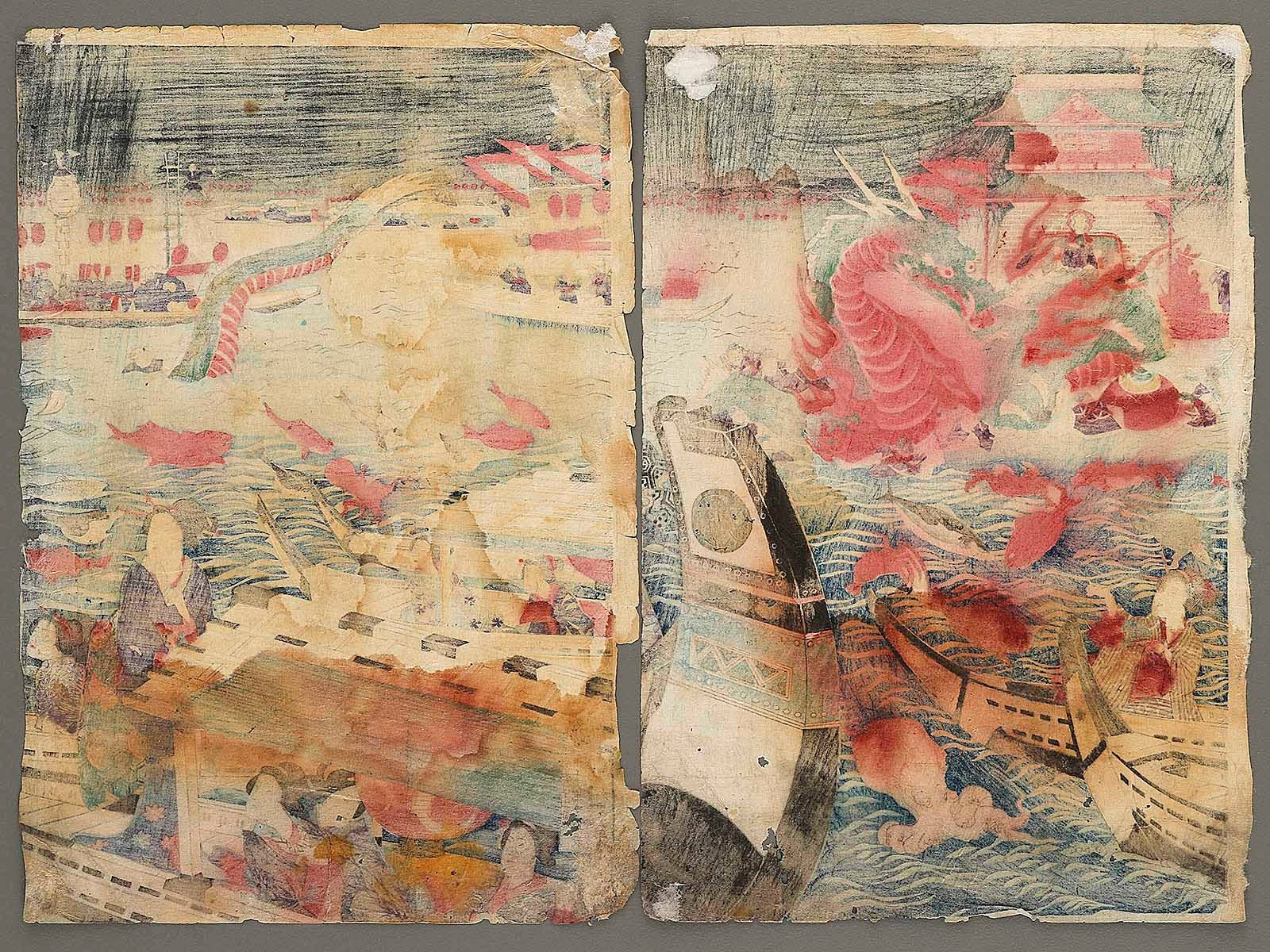 Condition : Antique item; (damaged by tear, spot, dirt, scribbles, worm-eaten holes, etc...) Please view pictures as they are a part of the description. Originally, it is a woodblock print consisting of three pieces, but since one piece is missing, there are only two pieces in total.