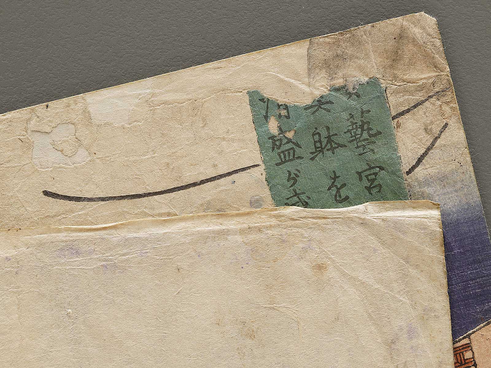 Condition : Antique item; (damaged by tear, spot, dirt, scribbles, worm-eaten holes, etc...) Please view pictures as they are a part of the description. Three sheets are connected. There is reinforce with backing.(urauchi)